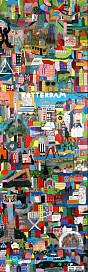 Rotterdam is de stad waar ik geboren en opgegroeid ben. Deze stad fascineert me nog steeds, zeker nu er steeds nieuwe architectuur te bewonderen is. In dit schilderij, dat ik maakte na een bezoek aan een tentoonstelling van Hundertwasser, zijn alle hits van het toeristische Rotterdam te vinden. Een veelkleurig schilderij waar je steeds iets nieuws op kunt ontdekken. Op mijn website zijn ook detailfoto's te zien.