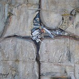 Het schilderij VERGANKELIJK laat op allerlei manieren de vergankelijkheid van het leven zien: in de natuur, zeepbellen, inktspatten, roest.