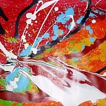 Intuïtief schilderij, kleurig, met paletmes gemaakt en veel beweging.