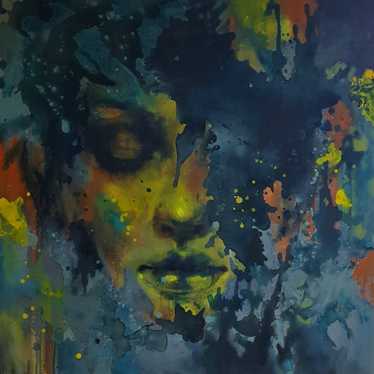 Groot schilderij gemaakt met acrylverf op doek. Het heeft een dik frame dat niet kan kromtrekken. Het is abstractie gecombineerd met het vrouwelijk gelaat. Het is heel expressief.