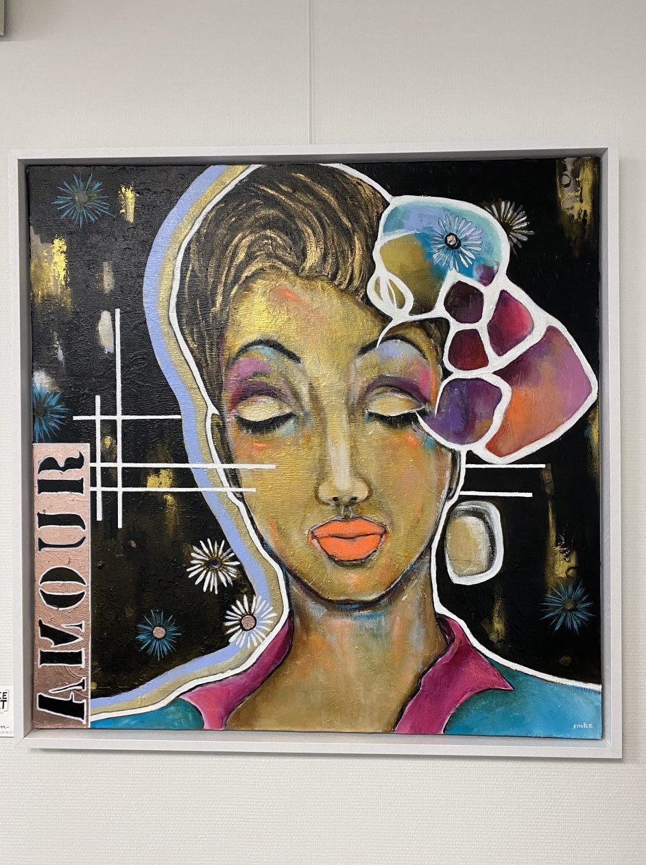 Schilderij Amour. Mixed media Art. Acryl met goud blad en mooie baklijst ,afgewerkt met vernis en ophangsysteem. Dit kunstwerk kun je bekijken / kopen in de showroom van Totalhome in Lelystad.