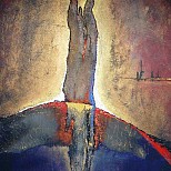 Acryl, Zand, rafia,ruw canvas en bladmetaal op doek. Geïnspireerd door de behoefte van de mens om vorm te geven aan dat waar we in willen geloven.