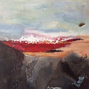 Schilderij met veel structuren,in de kleuren rood en grijs en bruin.