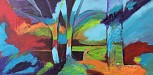 Acryl schilderij ,kleurrijk,waarin allerlei materialen verwerkt zijn.met gemengde technieken gemaakt.er us veel te zien in dit schilderij
